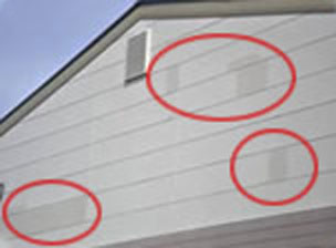 この写真の例は、サイディングボードに弾性塗料を塗装した結果、膨れてしまったものです。この状態でしばらくすると、やがて、ガマガエルのような肌になっていきます。